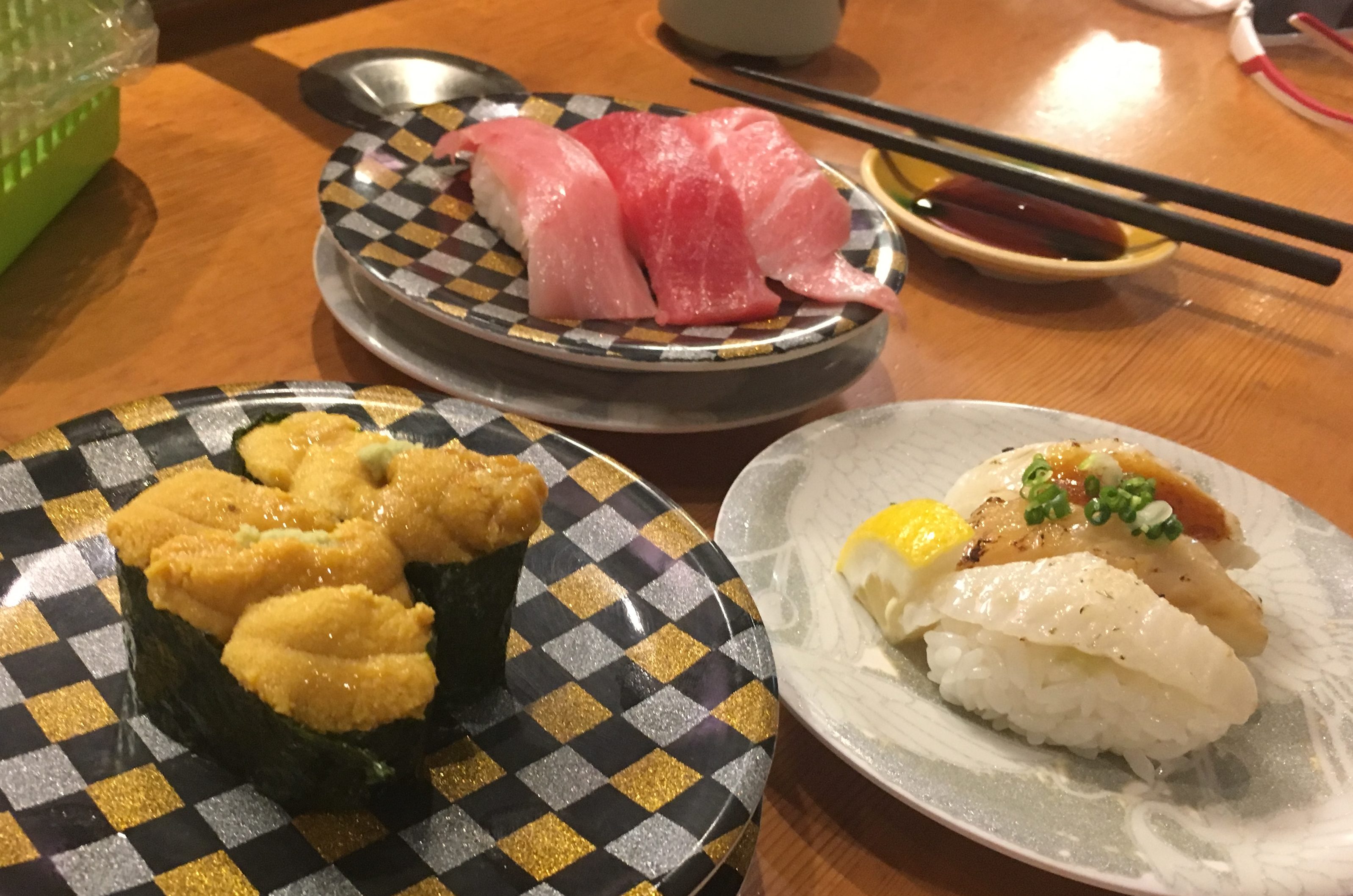 はじめの食事は、函館の新鮮な魚介類を食べられて、体調によって食べる量を調整できる回転すしがぴったり。